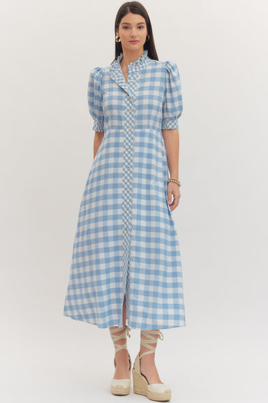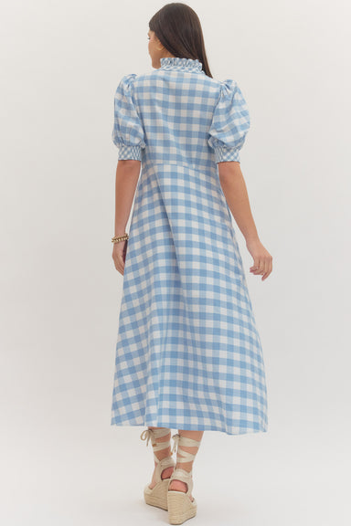 Elevate your wardrobe with this charming blue check midi dress, featuring romantic balloon sleeves and a delicate ruffle neckline that adds instant...