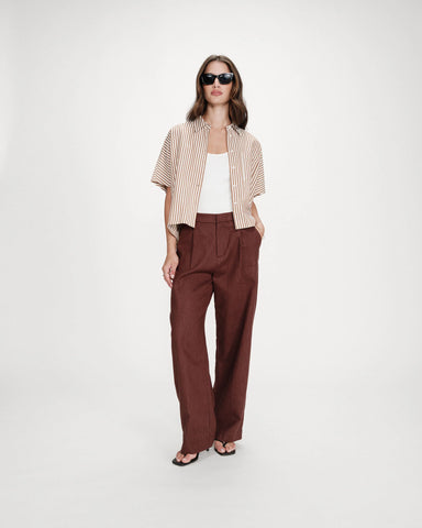 The Vercia wide striped shirt in mocha features a loose fit with short sleeves. Its classic collar and patch pocket on the left chest make it an es...