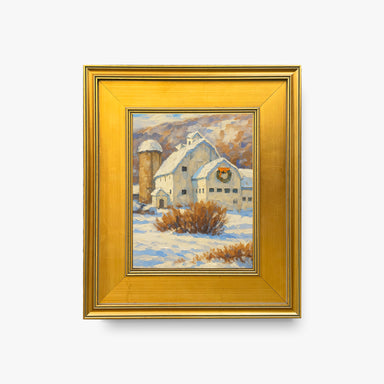 A warm holiday glow settles over the snow-covered barn as evening light brushes the valley in soft gold and blue. The wreath above the entry adds a...