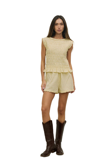 Elevate your wardrobe with the Suri Top, a striking sleeveless piece that combines texture and style. The crinkle plaid fabric creates visual inter...