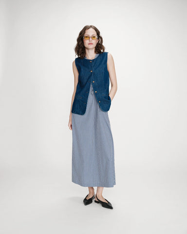 The Vallon sleeveless vest is made from 100% cotton denim fabric. The fitted cut and round neckline enhance feminine curves, making it a modern and...