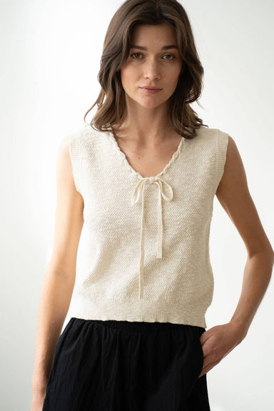 Sleeveless knit vest with a charming tie neckline and textured finish. The cropped silhouette layers beautifully or works solo in warm weather. Ivo...