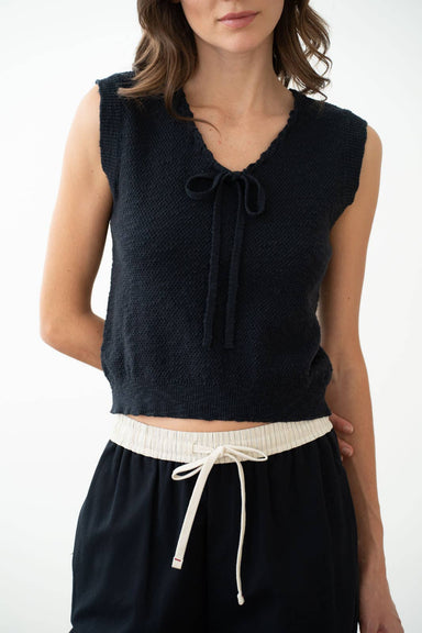 Sleeveless knit vest with a charming tie neckline and textured finish. The cropped silhouette layers beautifully or works solo in warm weather. Nav...