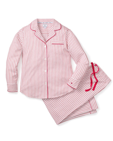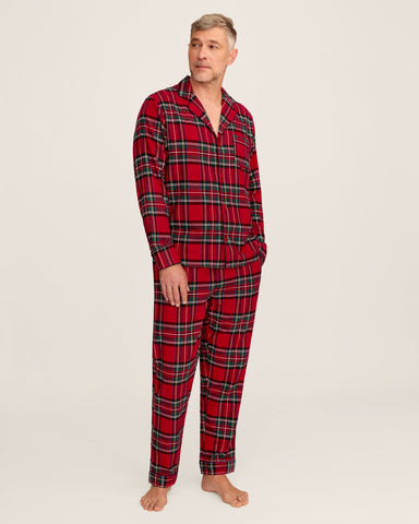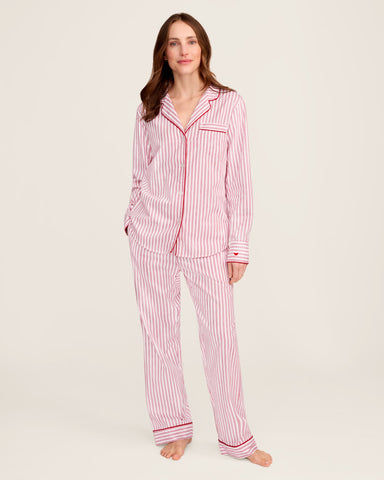 A new take on a classic pattern, with no frills just clean, crisp lines. This classic pajama set is accented with red piping and finished with pear...
