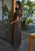 This dark brown long dress features a flattering V-neck and short sleeves, adorned with a charming polka dot print. Its flare silhouette and front tie strap add a stylish touch, making it a perfect choice for effortless elegance.