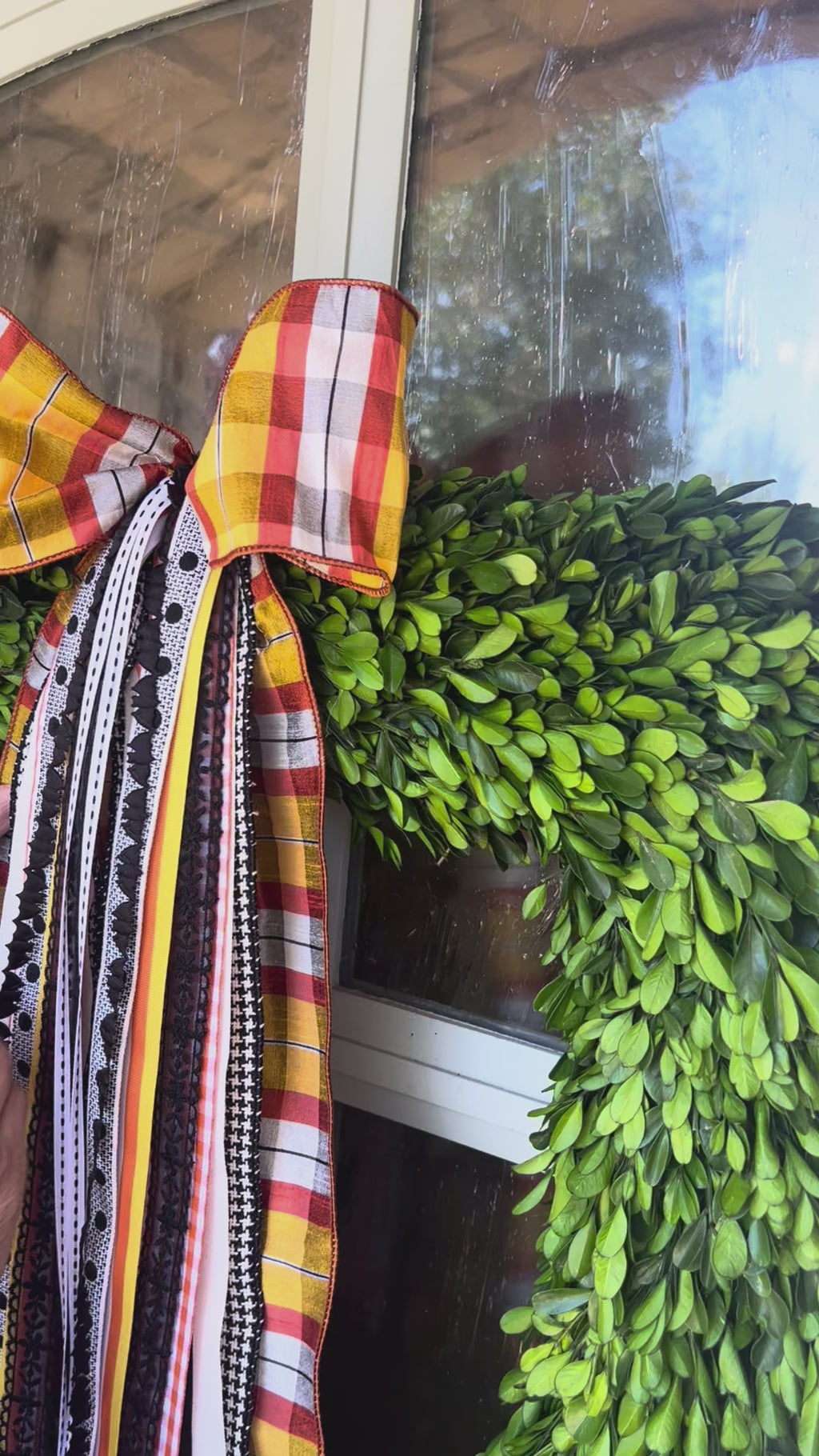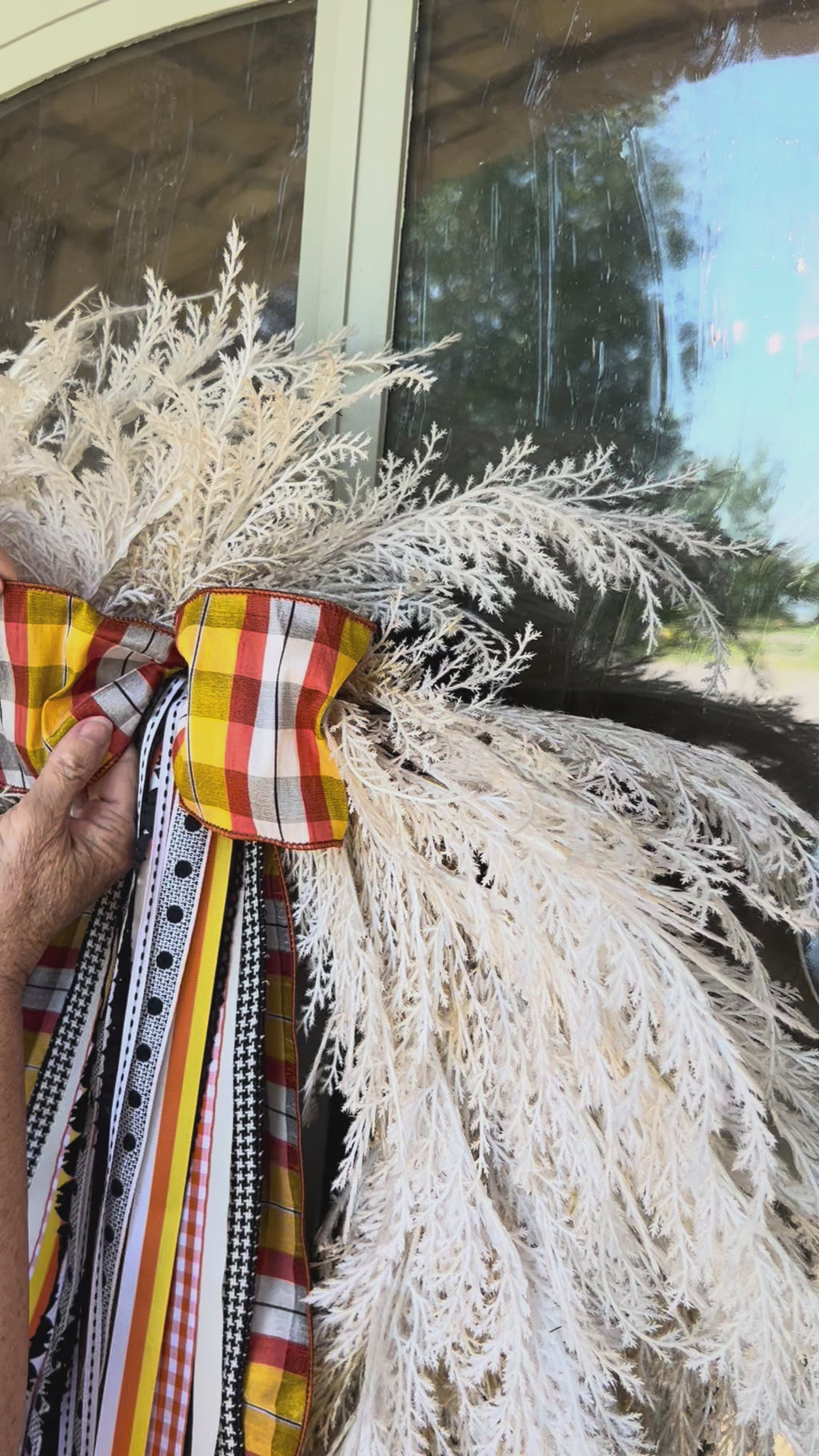 Flowing beneath the bow are cascading ribbons in a variety of charming patterns: classic gingham, cheerful polka dots, narrow stripes, and even textured houndstooth—offering a playful mix of modern farmhouse and vintage Halloween charm.