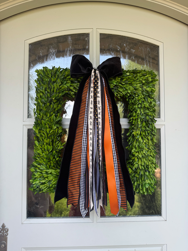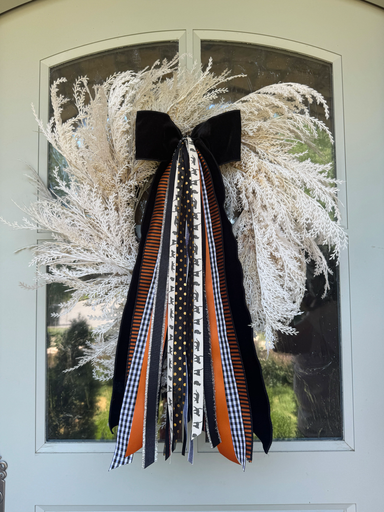 Bring a touch of Halloween mystery and charm to your front door with Black Magic. This handcrafted bow features rich layers of festive Halloween ri...