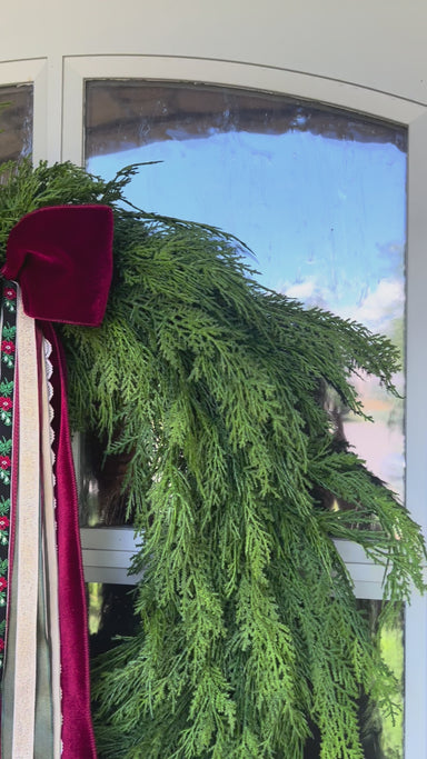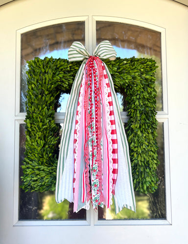 Heirloom Holiday Wreath Ribbon offers a classic, hand-tied bow in rich cranberry velvet that anchors a cascade of layered ribbons—vintage-style ho...