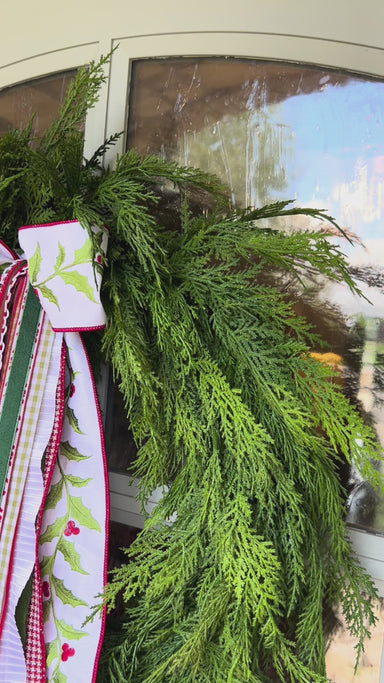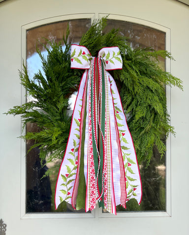 Holly and Ivy Wreath Ribbon brings classic Christmas cheer to your doorway. Layers of festive ribbon—embroidered holly and ivy on crisp white, mer...