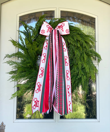 Candy-cane cheer meets classic plaid in Peppermint & Pine Wreath Ribbon. The mix includes a peppermint print on white, classic red-green tarta...