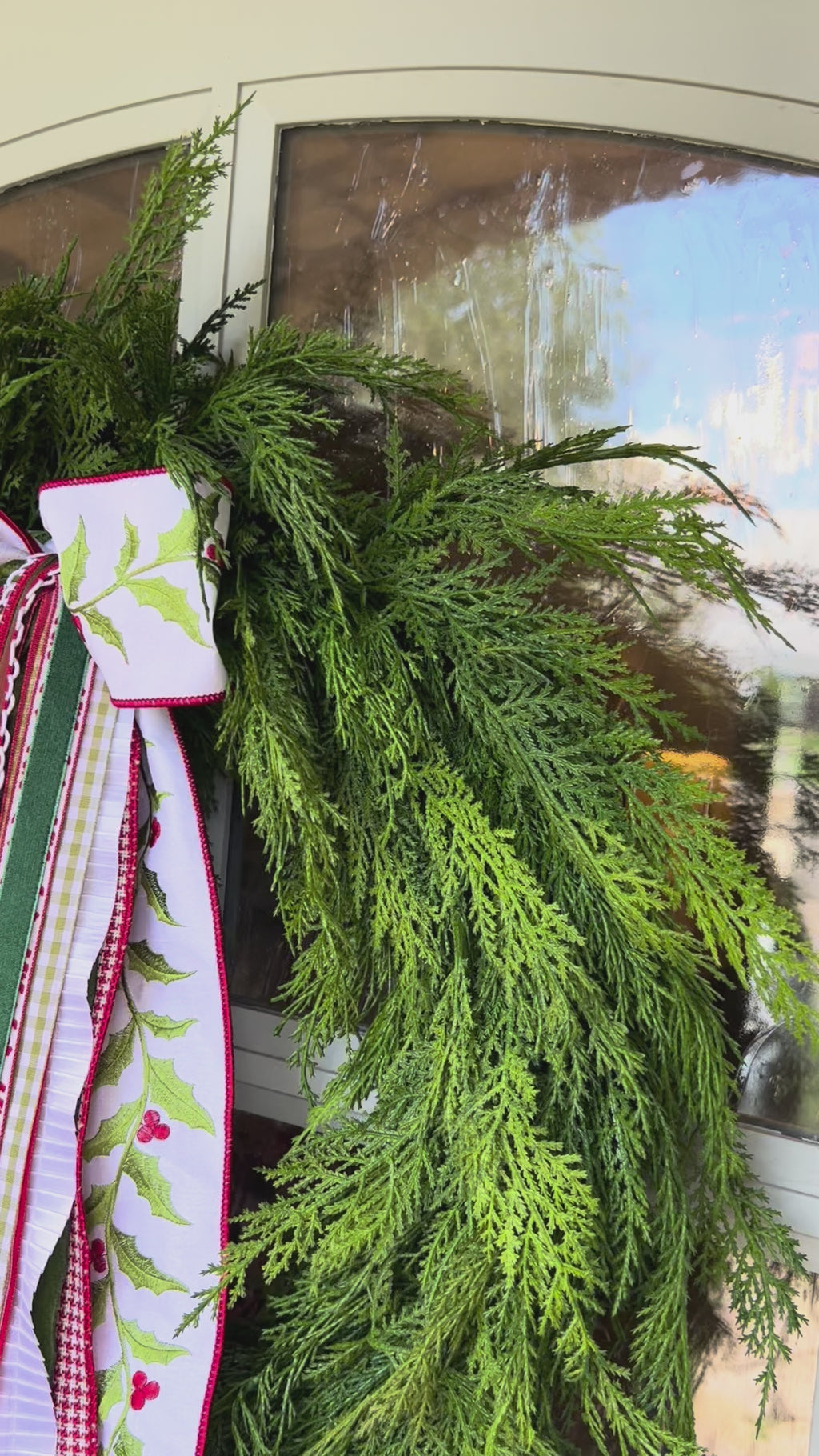 Holly and Ivy Wreath Ribbon brings classic Christmas cheer to your doorway. Layers of festive ribbon—embroidered holly and ivy on crisp white, merry red gingham, evergreen velvet, candy-cane stripes, and berry trims—are edged in red and tied into a full bow with long, draping tails. Bright, nostalgic, and ready for the season, it adds timeless holiday color to any wreath, mantel, or gift.
