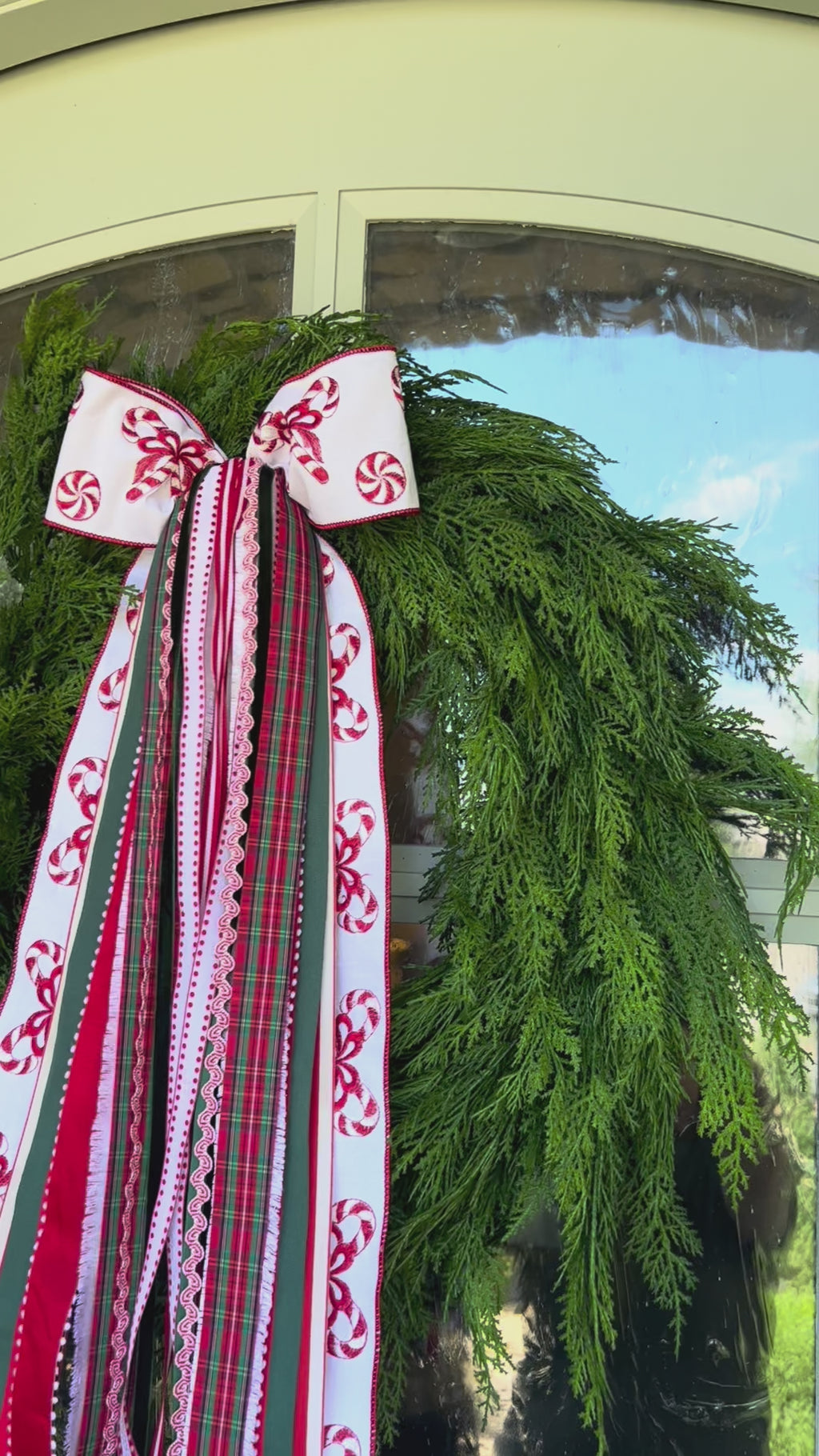 Candy-cane cheer meets classic plaid in Peppermint & Pine Wreath Ribbon. The mix includes a peppermint print on white, classic red-green tartan, forest-green grosgrain, bright red satin, and red-and-white candy stripe with playful ric-rac and stitched trims for texture. Designed to complement evergreen wreaths, garlands, and stair rails.