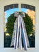 The Snow Château Wreath Ribbon set brings an elegant, wintery touch to any holiday wreath. This handcrafted bow features either a richly embroidered blue ribbon featuring a soft velvet-textured finish and ornate ivory scrollwork that gives the bow a regal, French-chateau feel OR a frosted blue ribbon with intricate glittering gold snowflakes, giving it a refined, storybook charm.