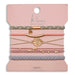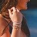 The Stride set includes five hair tie bracelets double as hair ties in the perfect earthy blend of tan, pink, gray and green. The gold charm is stamped with a compass to encourage all who wear it to keep exploring.
