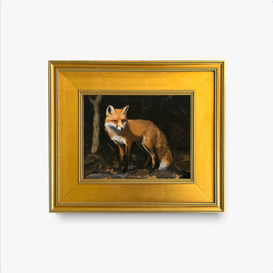 This captivating oil painting portrays a red fox poised in alert stillness against a shadowy backdrop. Its vibrant russet fur and distinctive white...