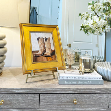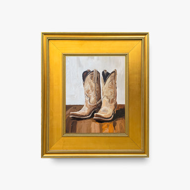 This impactful oil painting celebrates the iconic symbol of cowboy culture—a pair of tan leather boots presented against a clean white background w...