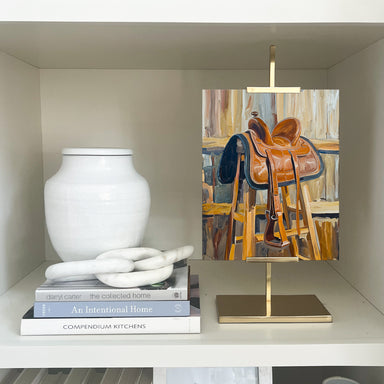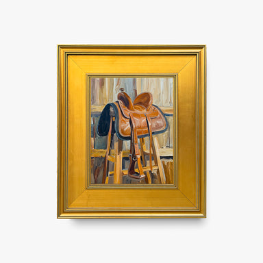 This evocative oil painting celebrates the heart of Western ranching—a well-crafted saddle resting on its wooden stand. Bold brushstrokes capture t...