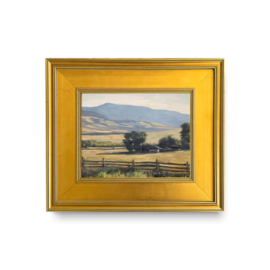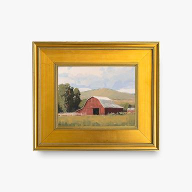 Experience the serenity of nature with Distant Haven, a stunning oil painting giclee capturing a rustic barn nestled in a peaceful valley with a mo...