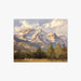 This oil painting captures the dramatic grandeur of untamed mountain wilderness. Towering snow-dusted peaks rise majestically against a cloud-scattered sky, their rugged contours catching soft light. Below, rolling foothills in muted green-blues transition into a verdant forest foreground, where loosely rendered trees create a textural boundary. The artist's expressive brushwork conveys both the solidity of the mountains and the movement of vegetation, while the earthy palette shifts from warm ochres in the foreground to cool blues in the distance. "Wild Peaks" evokes the timeless serenity and imposing presence of nature's most formidable landscapes.