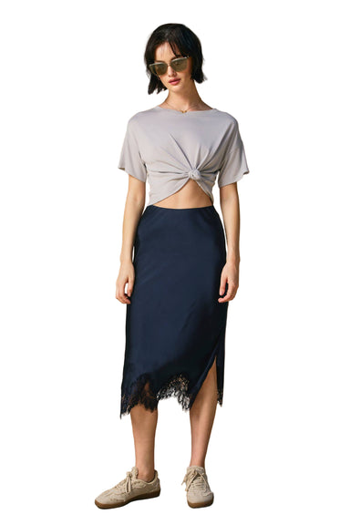This satin midi skirt features a pull-on style with an elastic waistband for easy wear. Its A-line silhouette is complemented by a delicate lace he...
