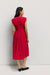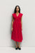 The Aleska Dress is crafted from midweight cotton poplin with a fully lined, sleeveless design, featuring a V-neck, pleated fitted waist, shoulder pleat detailing, midi length, and a partial front button closure.